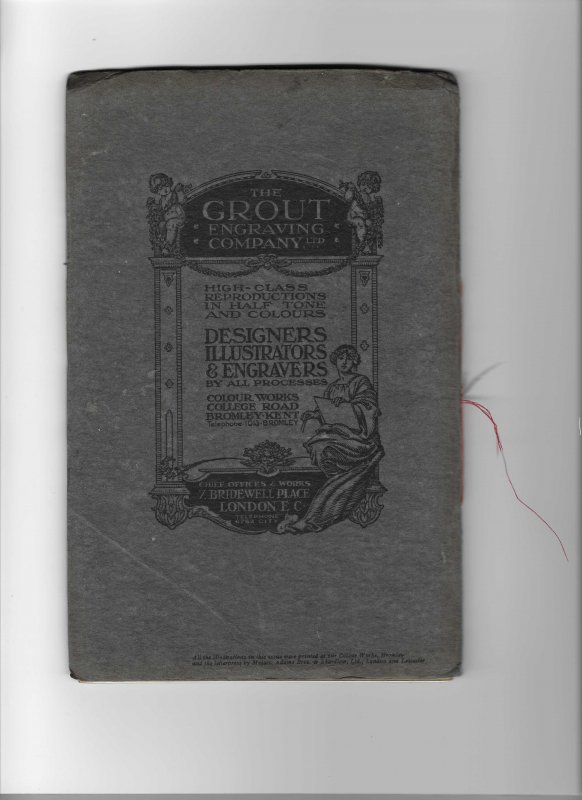 Undated, but c. 1910s. 8vo softback trade journal, in dark grey card covers, stitched binding with red cotton, tied at spine; 20pp with red and black letterpress, illustrated with 3 tipped-in colour plates (a 4th plate, of Penshurst, is missing), 3 tipped-in black and white portraits, one colour plate and a colour centrefold advert. Previous owner's bold pencil inscription to ffep. Occasional light foxing, covers a little creased and worn, wear and slight splitting to spine ends. Good overall.